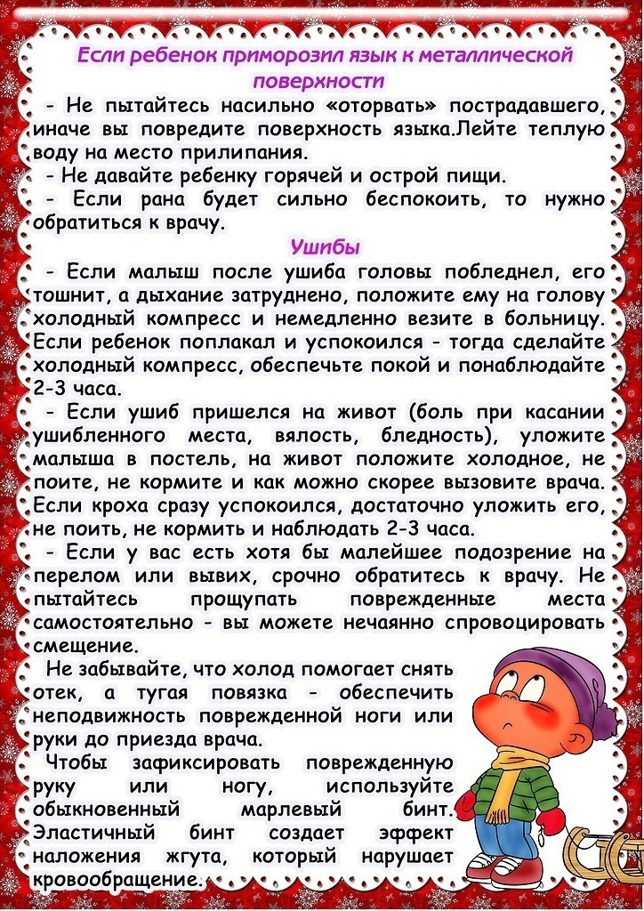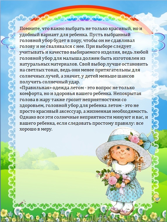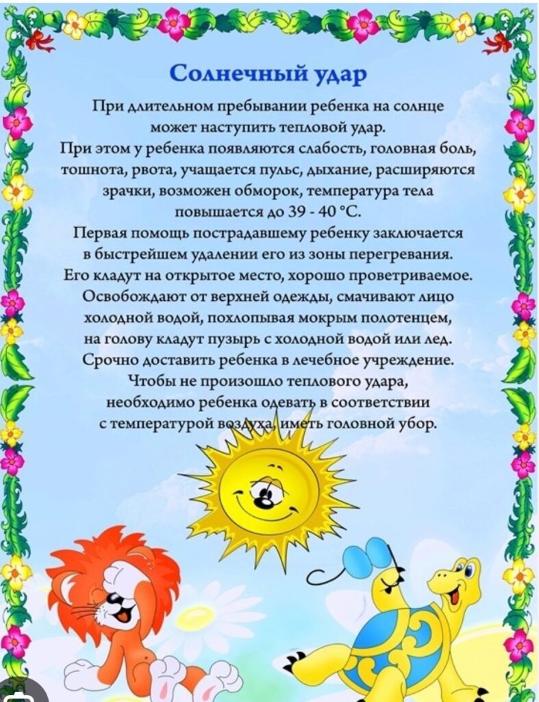 К травмам относятся тепловой удар и солнечные ожоги, получаемые ребенком в жаркий день. Следите, пожалуйста, за тем, как одет ваш ребенок, сколько времени он пробыл под открытым солнцем. Длительность воздушно — солнечных должна возрастать постепенно с 3-4 минут до 35-40 минут. В солнечный день обязателен головной убор.