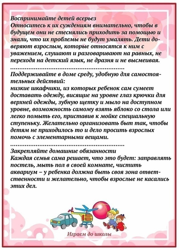 9. При расположении квартиры на первом этаже, зашторьте окна, а если кто-то стучится в окно, ваш ребёнок, не подходя к нему, должен громко крикнуть: «Папа, иди сюда!» Чтобы сократить время, в течение которого ребёнок будет находиться дома без присмотра, желательно подыскать ему какое-нибудь безопасное занятие (рисование, чтение, игры). Можно напомнить ребёнку сказку «Волк и семеро козлят». Объясните, почему волка можно назвать злоумышленником, а козлят – доверчивыми. При возвращении домой предупредите ребёнка об этом по телефону или домофону. Позвонив в дверь, ребёнок должен её открыть только после того, как вы полностью назовёте себя. Главное условие безопасности ребёнка – это доверительное отношение к родным. Он должен не бояться рассказывать родителям обо всём, что с ним происходит, ничего не скрывать. Достичь этого можно, создав в семье тёплую, доверительную атмосферу. Помните, что большинство несчастных случаев можно предотвратить. Для этого нужно приобрести «привычку к безопасности».
