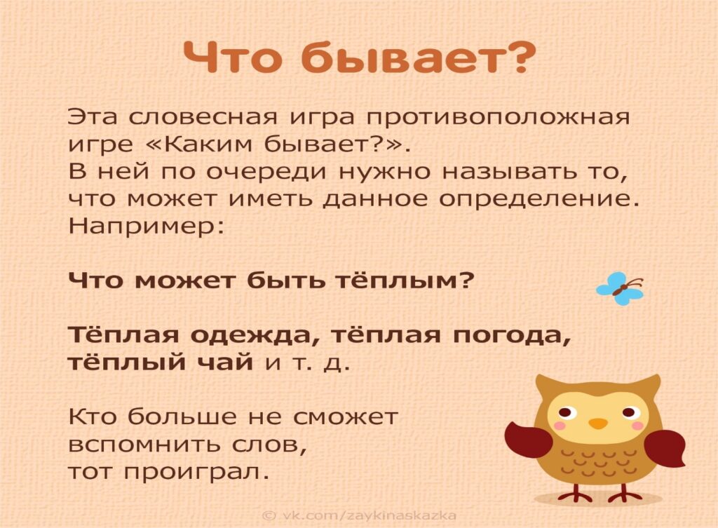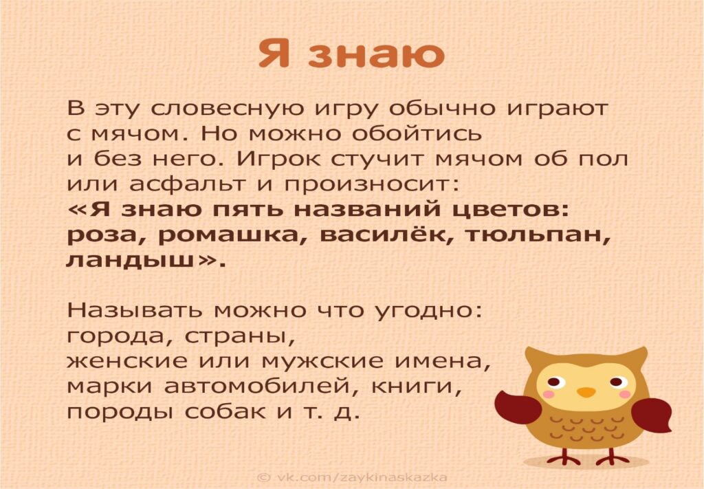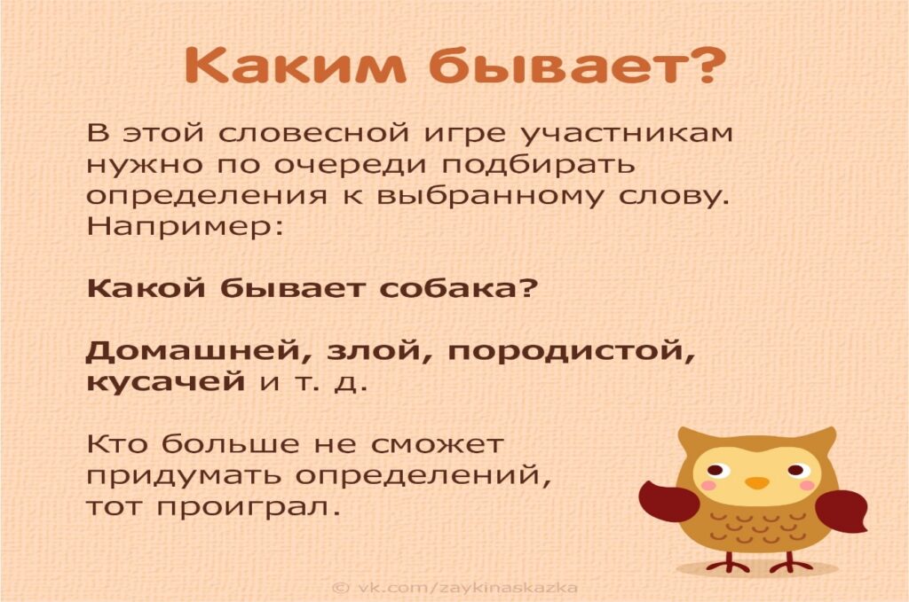 С детьми старшего дошкольного возраста и младшими школьниками полезно играть в словесные игры. Подобные игры развивают у детей речь и мышление, фантазию и воображение. Играть в словесные игры можно по дороге в школу или детский сад, в очереди или во время поездки в транспорте. Такие весёлые игры помогут скоротать монотонную дорогу или развлечь компанию детей и взрослых. Эти кapточки содержат примеры наиболее известных и популярных словесных игр для детей.