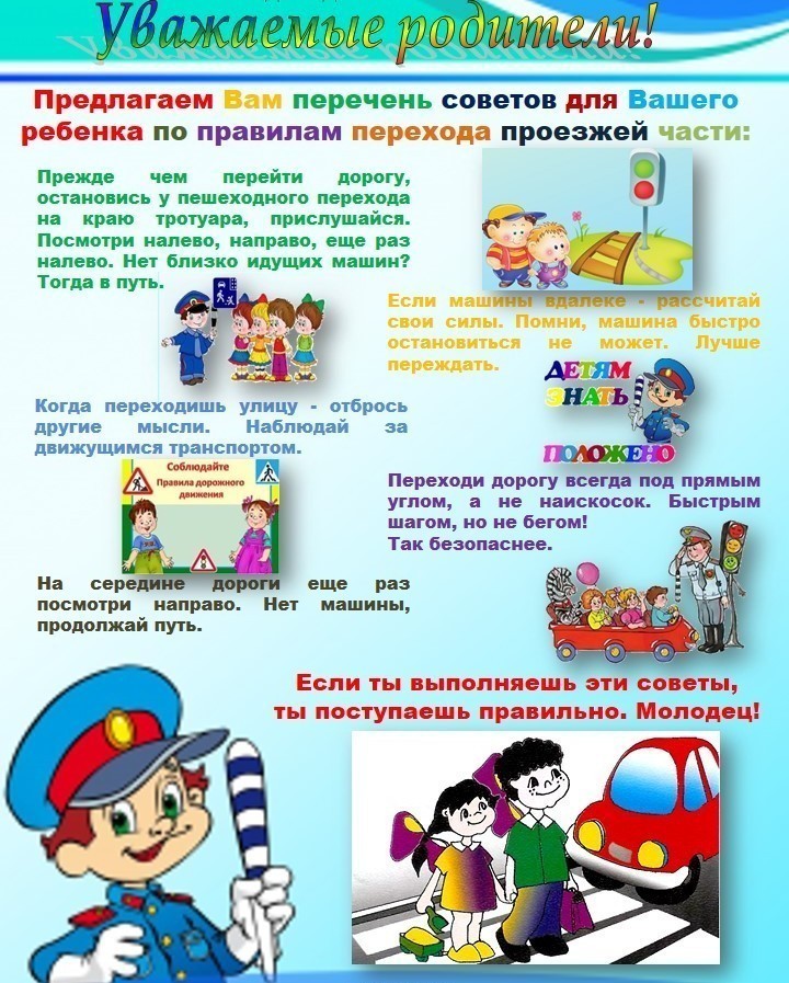 Своевременно обучайте детей умению ориентироваться в дорожной ситуации, воспитывайте у ребенка потребность быть дисциплинированным и внимательным на улице, осторожным и осмотрительным. Не отпускайте ребенка без взрослых на дорогу.Держите ребенка за руку, не разрешайте сходить с тротуара. Приучайте ребенка ходить спокойным шагом, придерживаясь правой стороны тротуара. Напоминайте, что дорога предназначена только для машин, а тротуар для пешеходов. Можно разучить с ребенком стихотворение: «Коль зеленый свет горит, значит, путь тебе открыт».Приучайте к правилу: переходить дорогу можно только по переходу (наземному и подземному). Не разрешайте ребенку в общественном транспорте высовываться из окна, выставлять руки или какие-либо предметы.