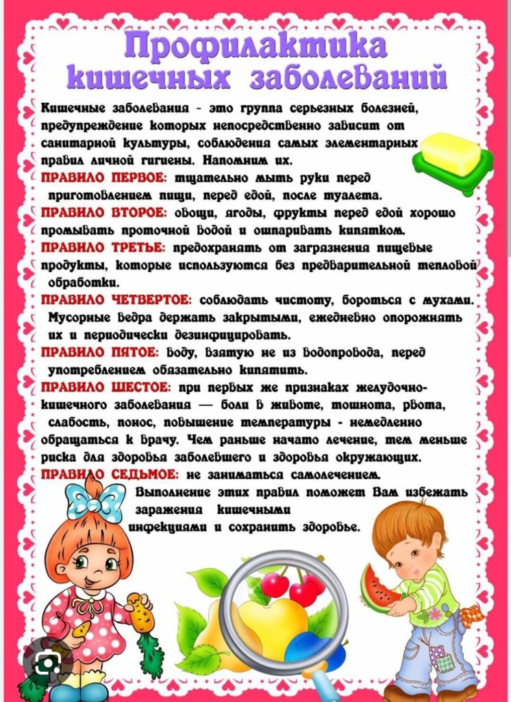 Летнее тепло не только согревает, но и, к сожалению, содействует размножению болезнетворных бактерий, которые чаще всего попадают в организм с недоброкачественной пищей. Пищевые продукты и элементарное несоблюдение правил гигиены могут вызвать кишечные инфекционные заболевания.Не забывайте обязательно мыть овощи и фрукты перед употреблением.Очень важное правило: «Мыть руки перед едой! летом, как никогда, актуальное! » Перед тем как перекусить на улице, на прогулке, обратите внимание, есть ли возможность помыть руки.Всегда берите с собой влажные салфетки,которые выручат в нужную минуту.