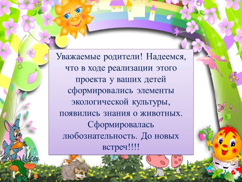 Уважаемые родители! Подошёл к концу наш проект «Лесные зверюшки». Надеемся, что у ваших детей в ходе реализации проекта сформировались знания о лесных зверях (зайце, лисе, волке, медведе) их детёнышах, повадках и среде обитания, об их внешнем виде и различиях. У детей развились творческие способности, коммуникативные навыки, познавательная активность, любознательность и любовь к животным. Сформировались основы экологической культуры. Предлагаем вам в завершении проекта разукрасить с детьми лесных жителей. Желаем удачи!!!