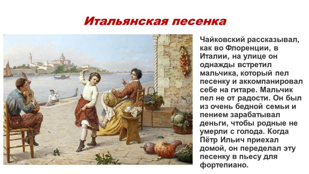 Работа над проектом «Музыкальный островок детства» продолжается. Следующая тема, которой касается Чайковский в своём «Детском альбоме», -э то тема народной музыки. За стенами уютной детской разворачивается совсем иная жизнь – уличная, разгульная! Послушайте следующие две пьесы: плясовую «Камаринская» и миниатюру «Мужик на гармонике играет».