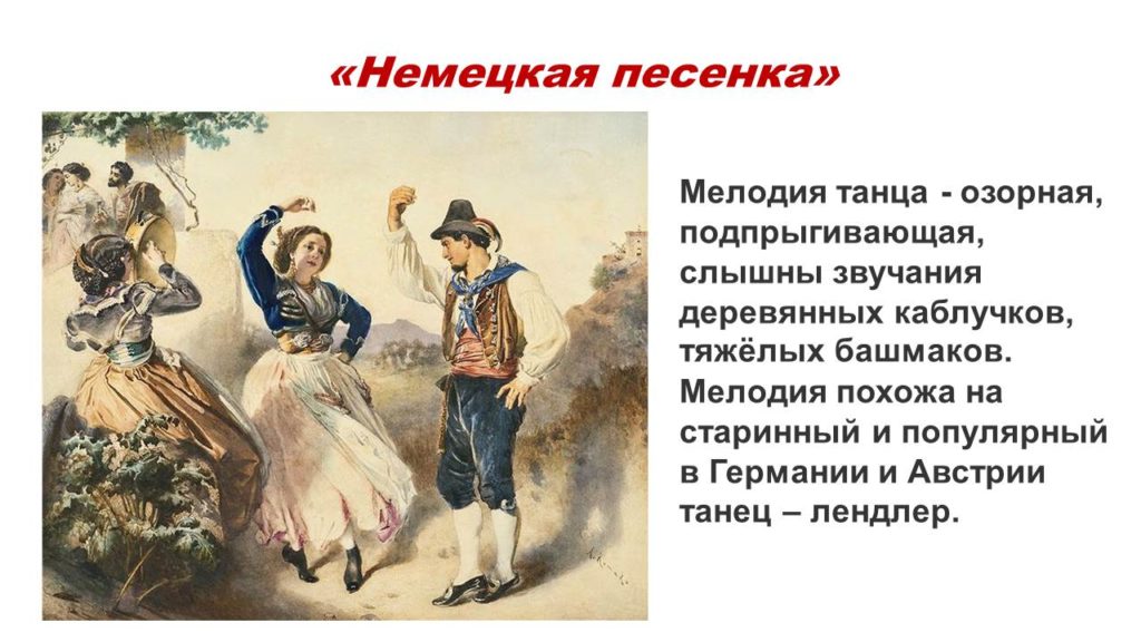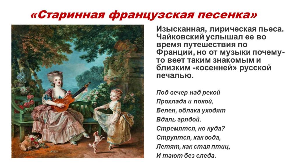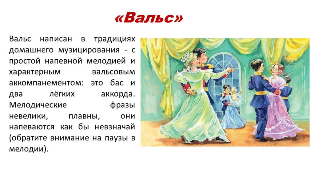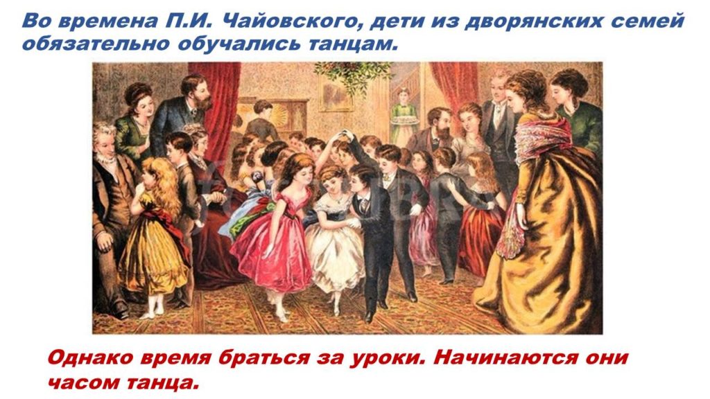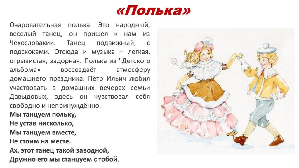 Уважаемые родители! Далее в рамках проекта по изучению «Детского альбома» предлагаю познакомиться с темой танцев. Во времена Чайковского занятия танцами были обязательны для детей дворянского сословия. Послушайте Польку, Мазурку и Вальс