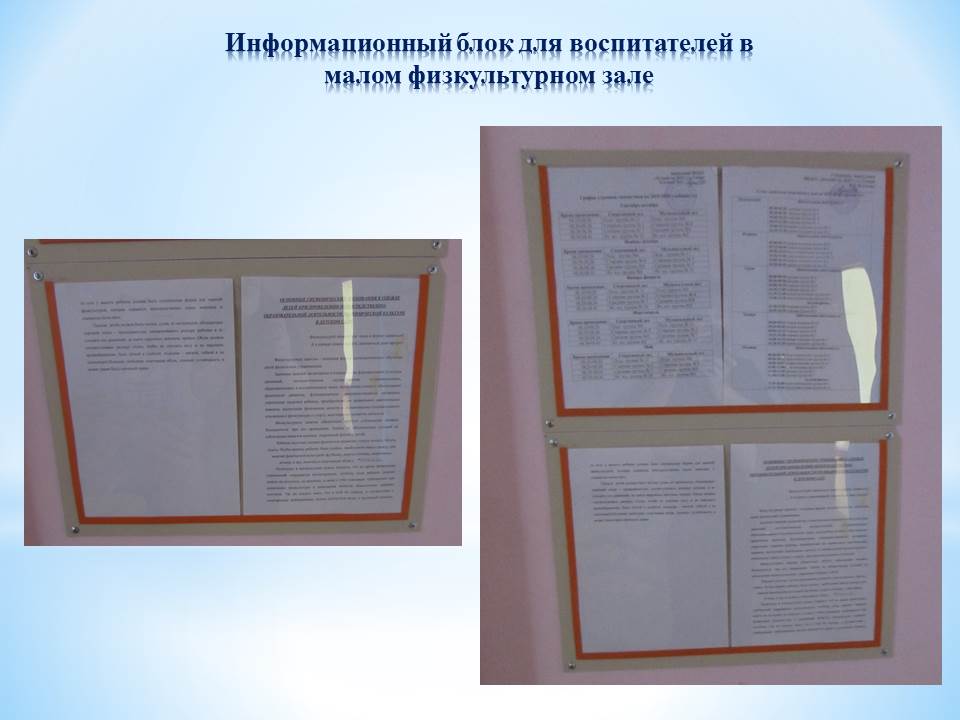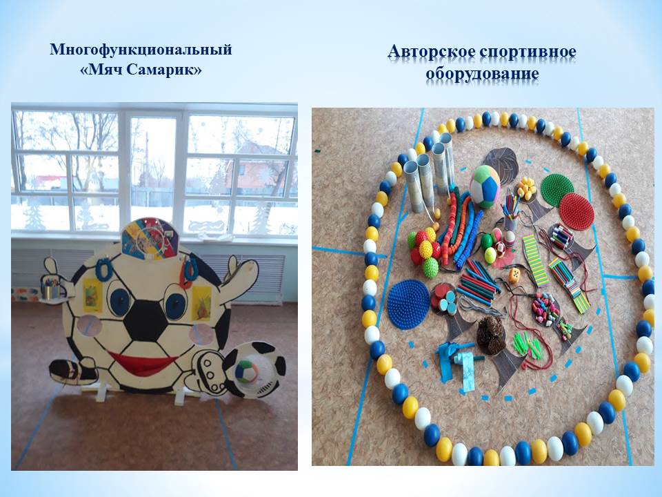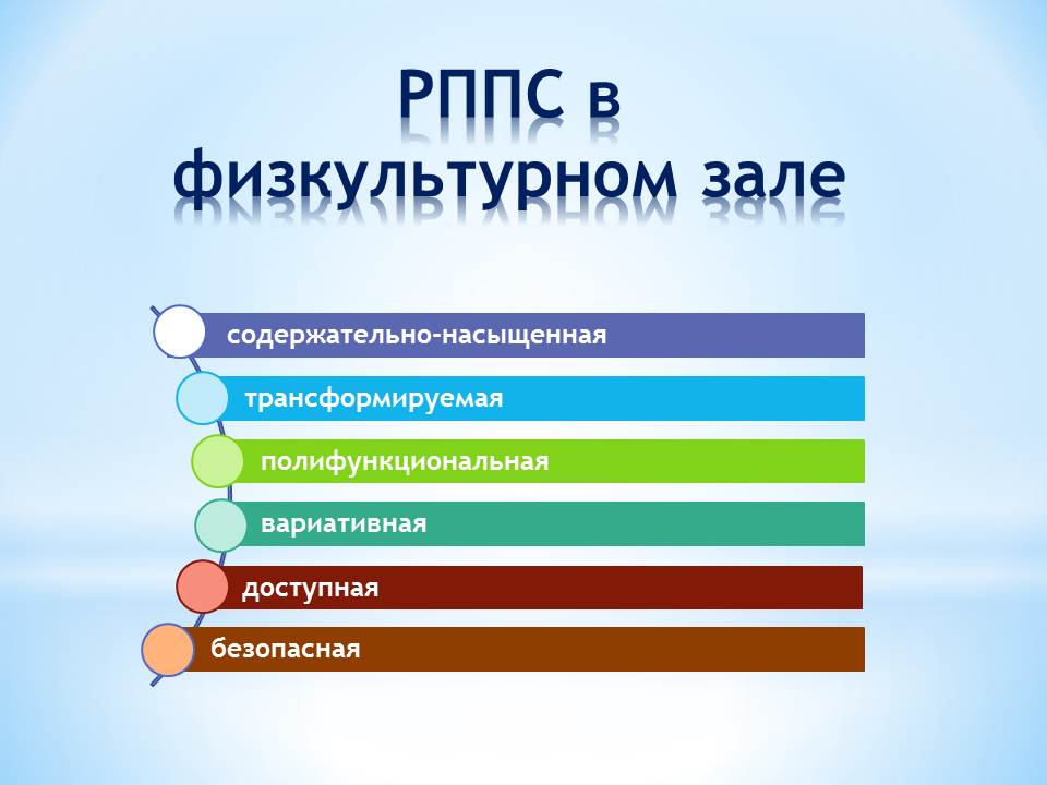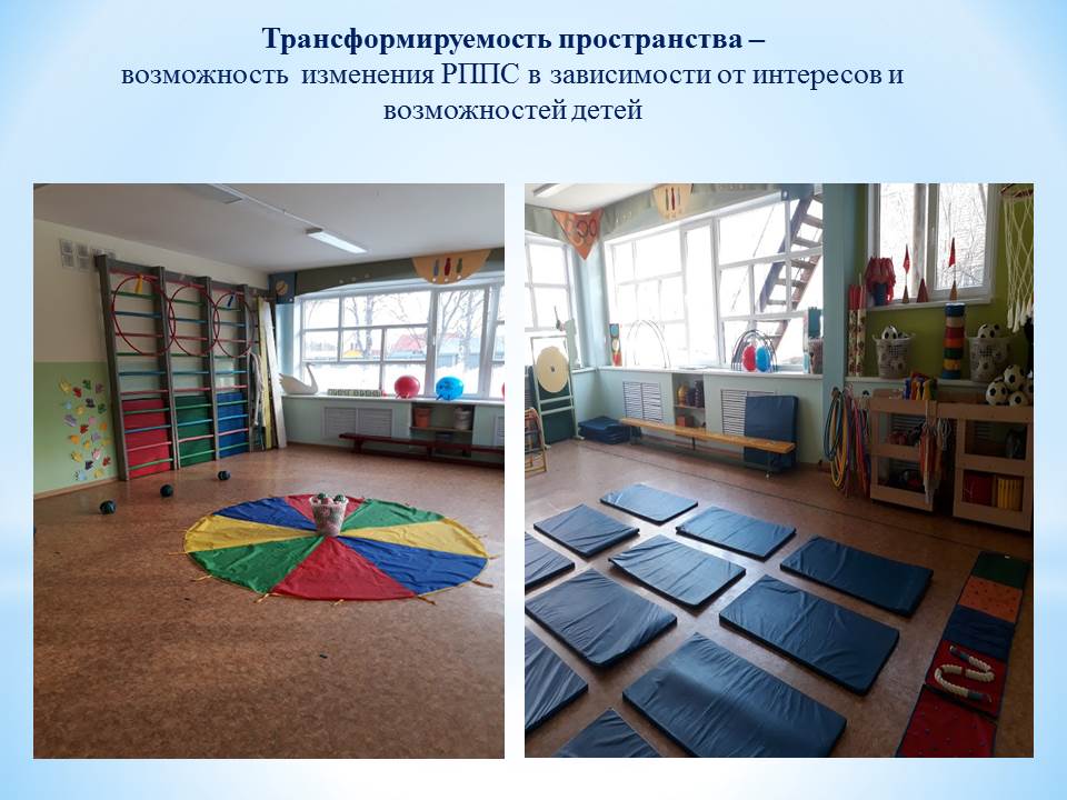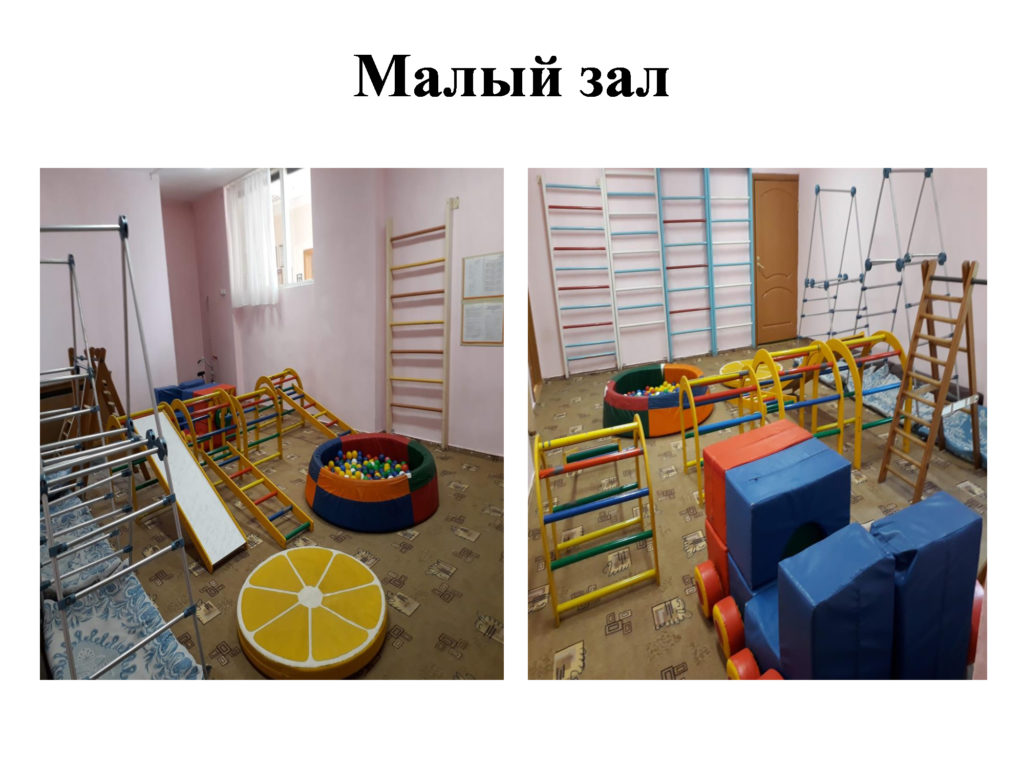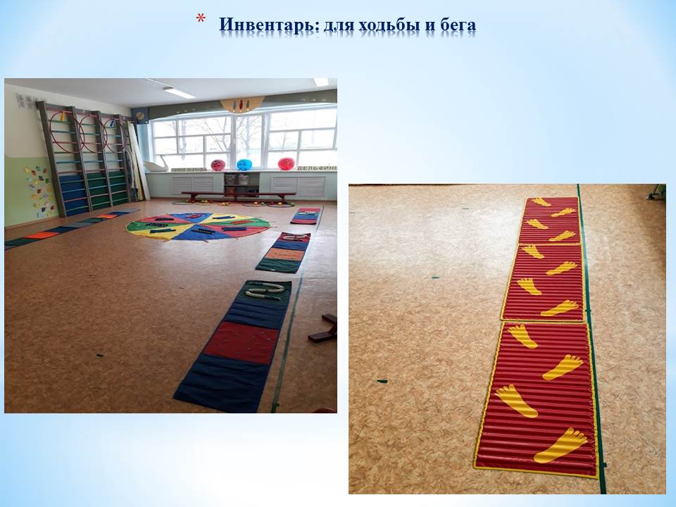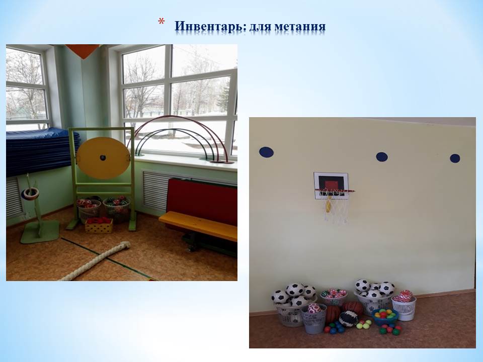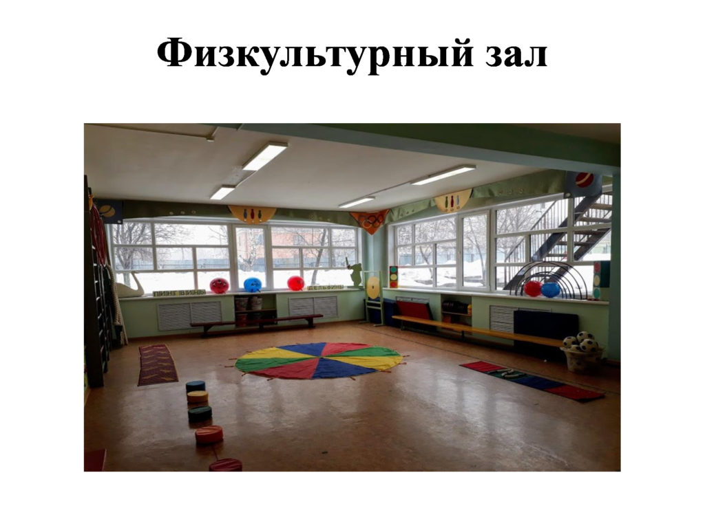 Комплект физкультурного оборудования для занятий по физической культуре согласно требованиям СанПиН: оборудование для прыжков, метания, лазания, равновесия (по 30 комплектов); шкаф для используемых инструктором пособий, игрушек, атрибутов; скамейки различной высоты (5 шт), мячи разного диаметра (по 30 комплектов); обручи, гимнастические палки, набивные мячи и мешочки, гантели (по 30 комплектов); канат, шведская стенка, нестандартное физкультурное оборудование (беговая дорожка — 1 шт.). Помещение может быть приспособлено для использования лицами с ОВЗ.