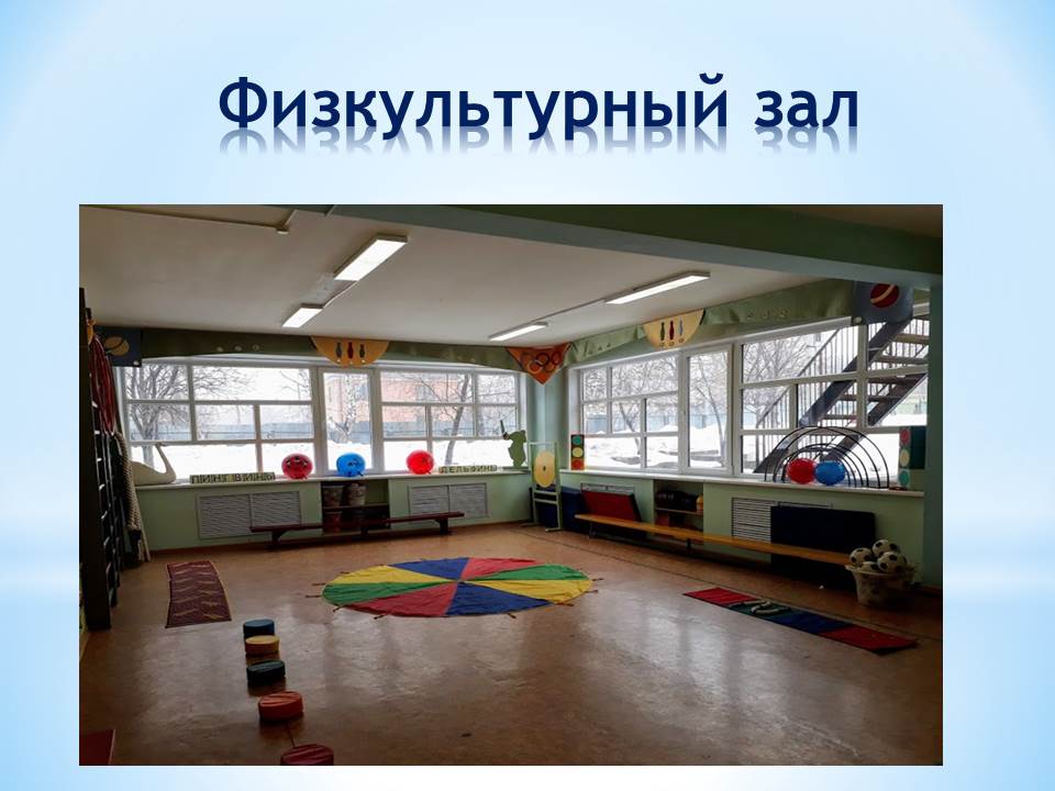 Зал спортивный — стадион, задает здоровый тон! Есть мячи, скакалки, маты, кегли, обручи, канаты!