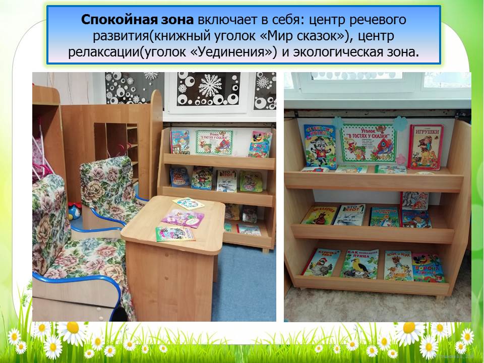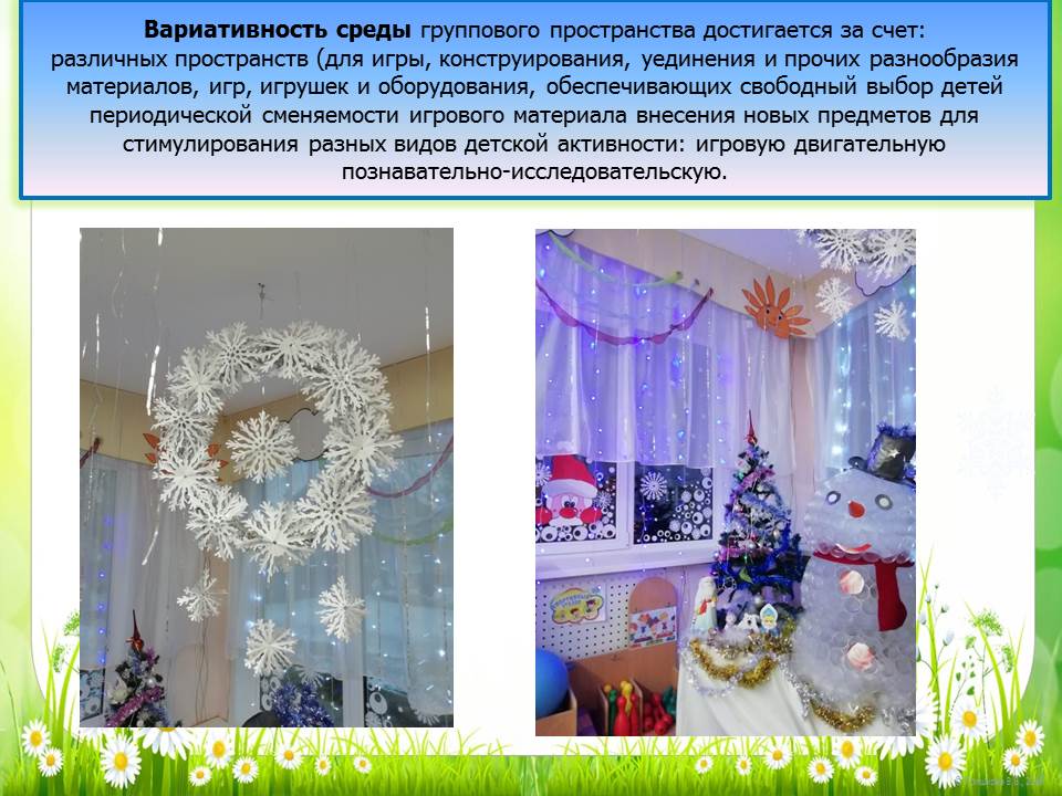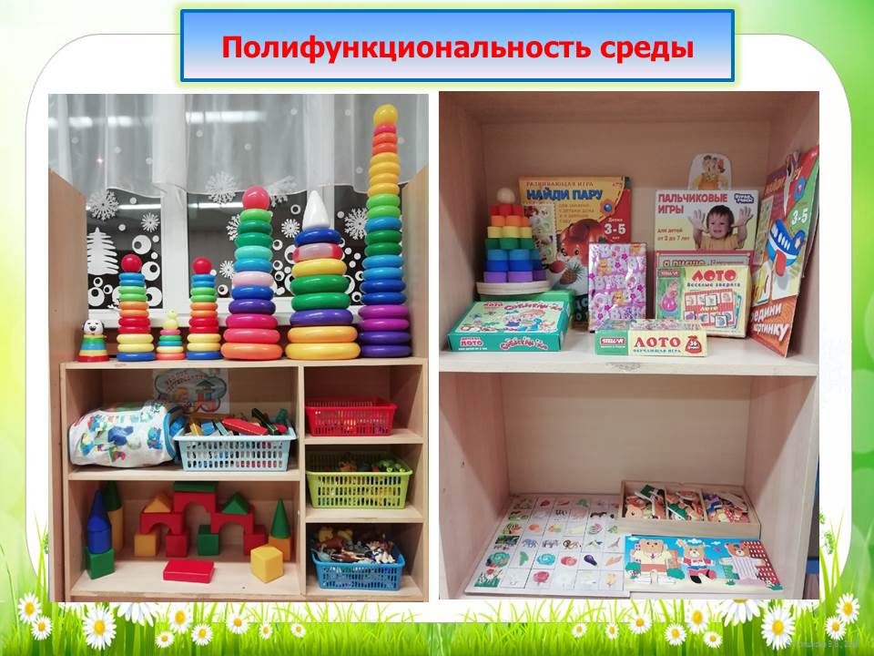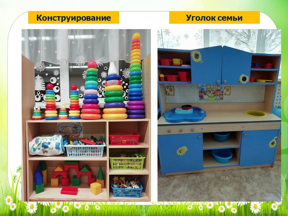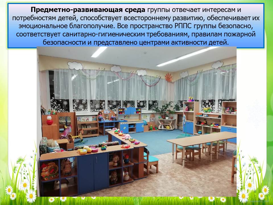 При создании предметно-развивающей среды воспитатели учитывают возрастные, индивидуальные особенности детей своей возрастной группы. Оборудованы групповые комнаты, включающие игровую, познавательную, обеденную зоны. Группы постепенно пополняются современным игровым оборудованием, современными информационными стендами.Предметная среда всех помещений достаточно насыщена, выдержана мера «необходимого и достаточного» для каждого вида деятельности, представляет собой «поисковое поле» для ребенка, стимулирующее процесс его развития и саморазвития, социализации.
