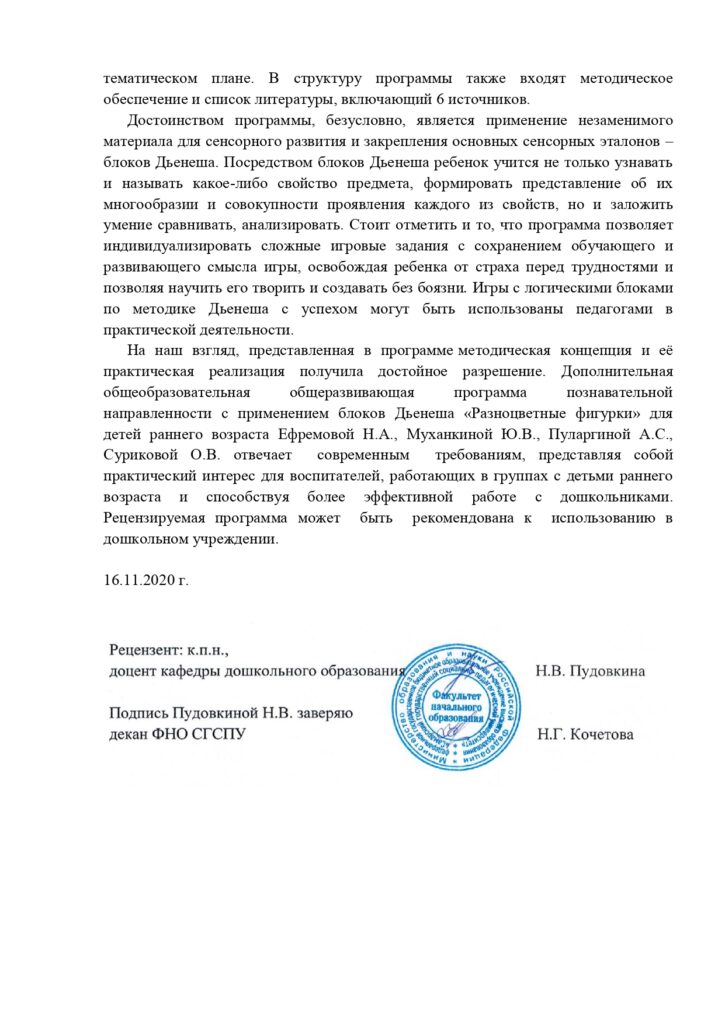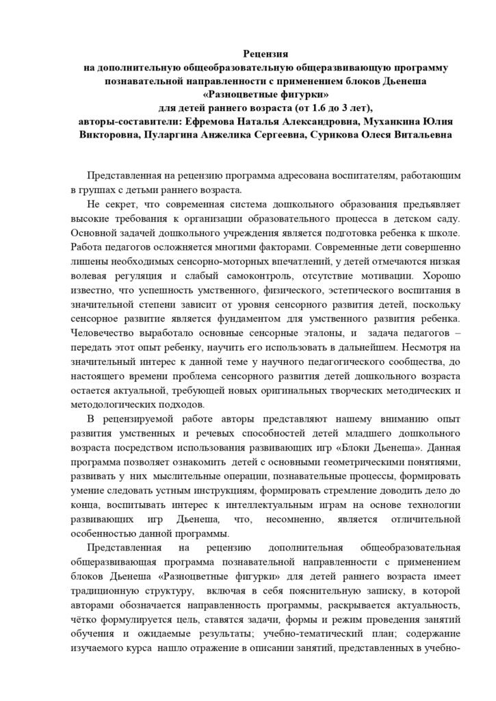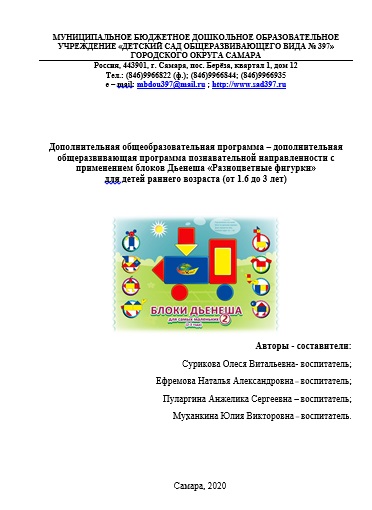 Дополнительная общеобразовательная программа – дополнительная общеразвивающая программа познавательной направленности с применением блоков Дьенеша «Разноцветные фигурки» для детей раннего возраста (от 1.6 до 3 лет) Авторы — составители: Сурикова Олеся Витальевна- воспитатель; Ефремова Наталья Александровна – воспитатель; Пуларгина Анжелика Сергеевна – воспитатель; Муханкина Юлия Викторовна – воспитатель.