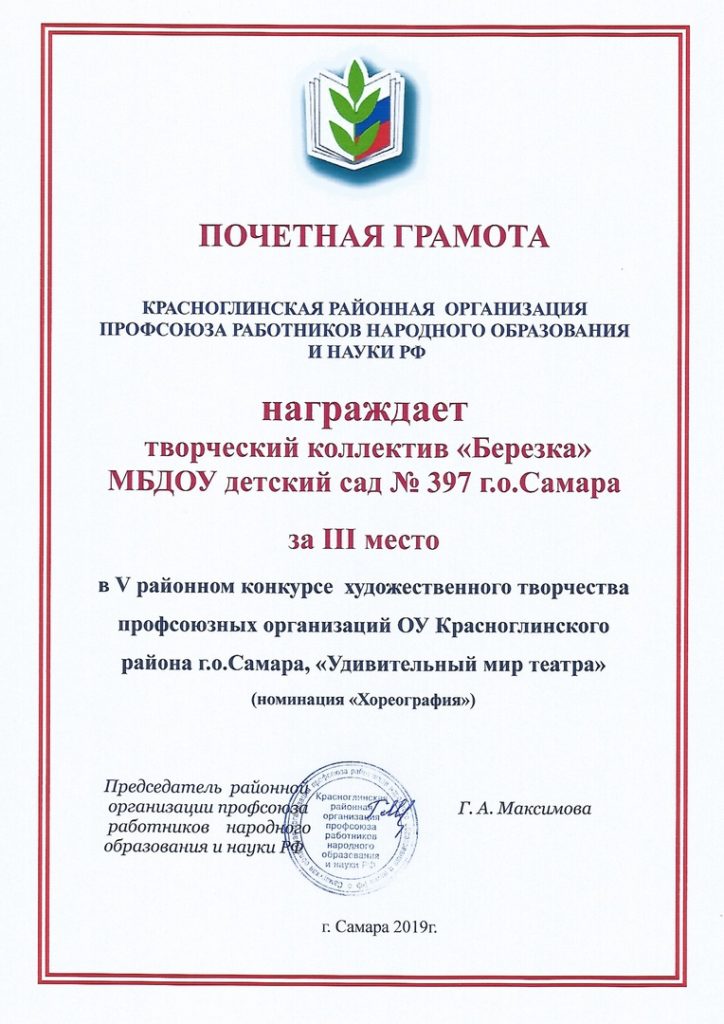 Заслуженные награды смотра-конкурса художественного творчества «Удивительный мир театра!»-2019 год и «Нет у вдохновения конца!»-2018 год среди работников и коллективов первичных профсоюзных организаций образовательных учреждений Красноглинского района г.о. Самара. Звезды коллектива — Горбулева Л.В., Бондяева Е.В., Серова М.Н., Шевлякова И.В., Ахмедова М.Х., Мыцык Н.В., Барышкина О.В., Квичастая О.В., Хамцова Т.Н.,