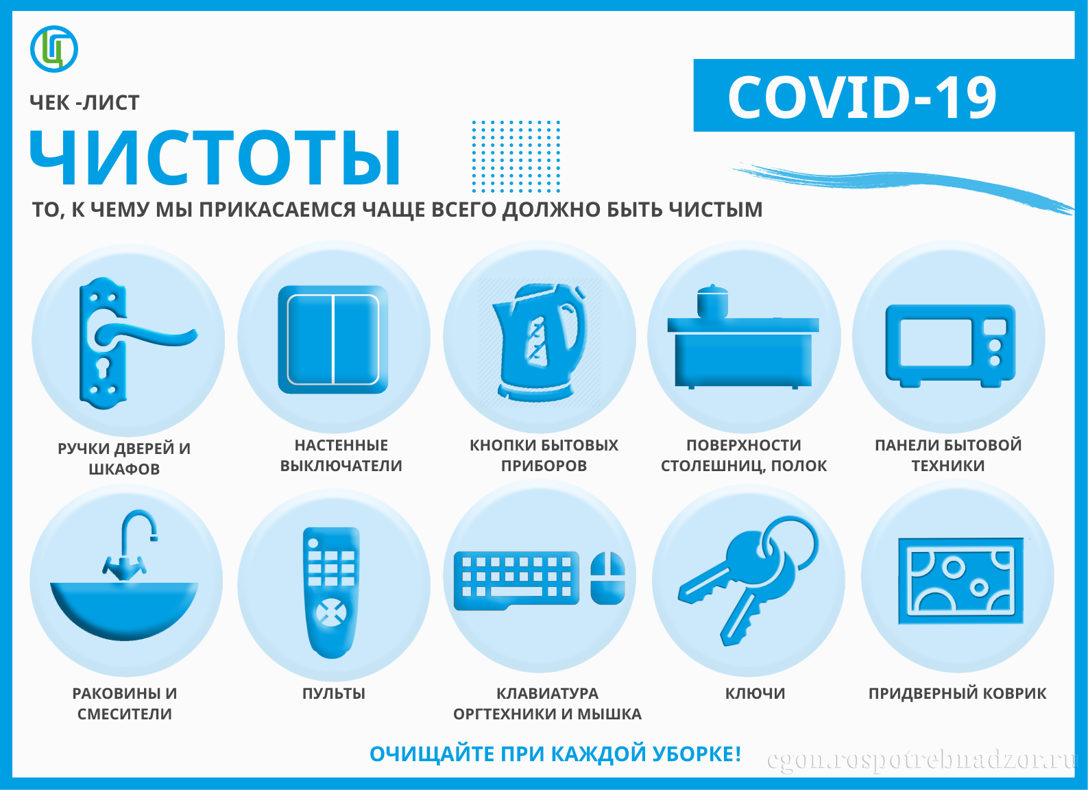 • Проводить влажную уборку дома ежедневно, включая обработку дверных ручек, выключателей, панелей управления оргтехникой.