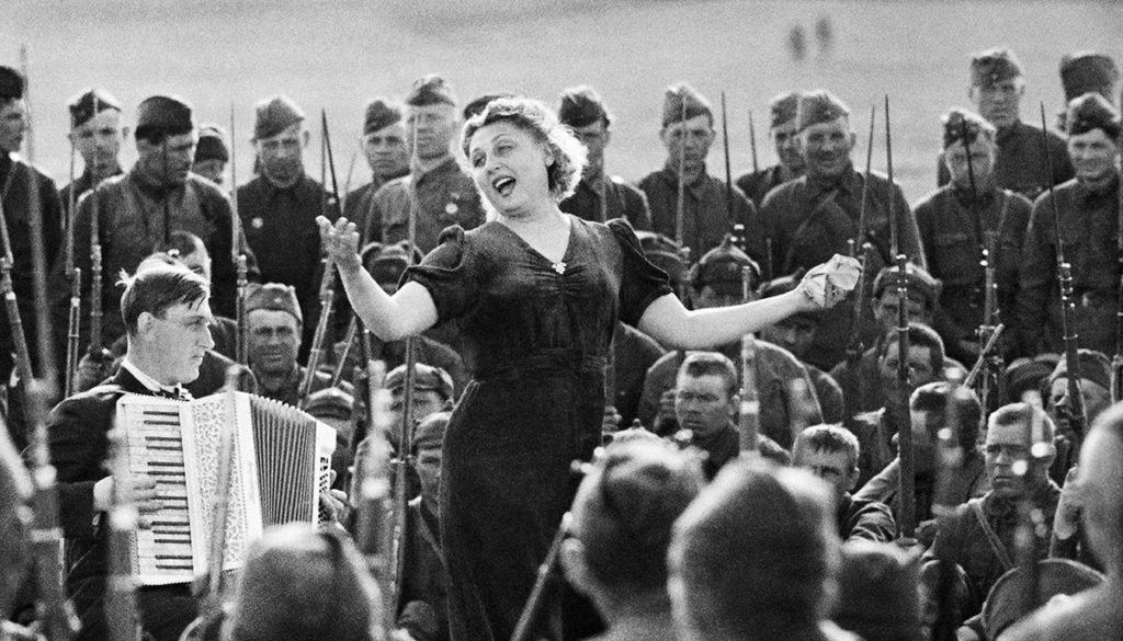 Великая Отечественная война… Страшная, жестокая… До песен ли в такое тяжелое время? Но в годы Великой Отечественной войны были созданы тысячи песен, которые вдохновляли бойцов на подвиг, вселяли в них мужество. Уже в первую неделю войны композиторами и поэтами были написаны около двухсот новых песен, большинство из которых сразу же «ушли на фронт». Предлагаю послушать одну из самых любимых всеми песен военных лет, песню «Катюша». Героиня песни – девушка, которая любит бойца и ждёт от него письма. Песня стала настолько популярной, что именем Катюши народ назвал новое оружие, наводившее ужас на врага – ракетный миномёт. «Кто сказал, что надо бросить песни на войне? После боя сердце просит музыки вдвойне!». Слушайте эту замечательную песню и подпевайте.